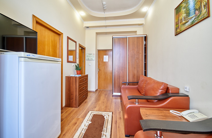 Площадь номера - 18-23 кв.м. 2 осн. места. 1 доп. место. Балкон. Мебель: диван, комод, кресло, кровать двуспальная, прикроватные тумбочки, стол, стулья, шкаф. Оборудование: гладильная доска, кондиционер, мини-холодильник, набор посуды, телевизор, утюг, электрочайник. Санузел: с душем, туалетные принадлежности. Сервис: смена полотенец, смена постельного белья, уборка номера.